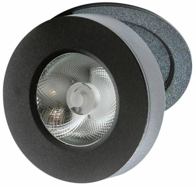 Modern stílusú, 3000K-es, beépített LED-es süllyeszthető lámpa, melynek feje 350°-ban forgatható és 90°-ban billenthető. Kivágási mérete 7-8 cm, világítási szöge 24°. IP54-es vízvédelme miatt ideális kültérre és a fürdőszobába is.