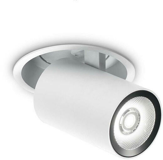 Fehér színű alumínium mennyezetbe építhető spot lámpa beépített LED fényforrással, 90 fokig állítható és 350 fokban forgatható fejjel.