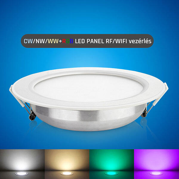 RGB CW+WW LED panel (állítható hideg, közép, melegfehér alapmegvilágítás és RGB színes) WW+NW+HW+RGB A távirányító nem tartozéka a terméknek, bármilyen RGB+CCT táviránítóval használható. Rádiós és wifi vezérlésű besűlyeszthető kerek led panel. 12W 1100Lumen