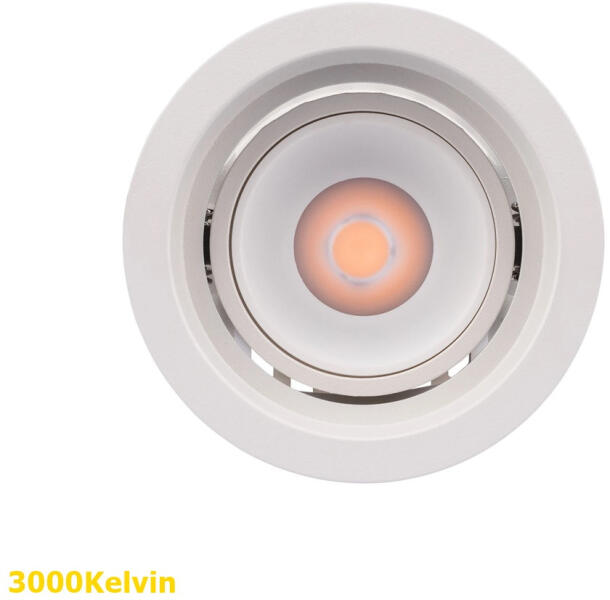 Matt fehér színű alumínium öntvény billenthető mennyezetbe építhető spot lámpa polikarbonát lencsével, meleg fehér színhőmérsékletű beépített LED fényforrással és működtetővel.