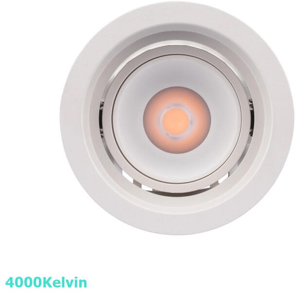 Matt fehér színű alumínium öntvény billenthető mennyezetbe építhető spot lámpa polikarbonát lencsével, természetes fehér színhőmérsékletű beépített LED fényforrással és működtetővel.