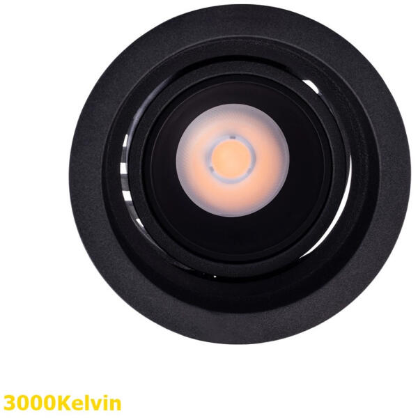 Matt fekete színű alumínium öntvény billenthető mennyezetbe építhető spot lámpa polikarbonát lencsével, meleg fehér színhőmérsékletű beépített LED fényforrással és működtetővel.