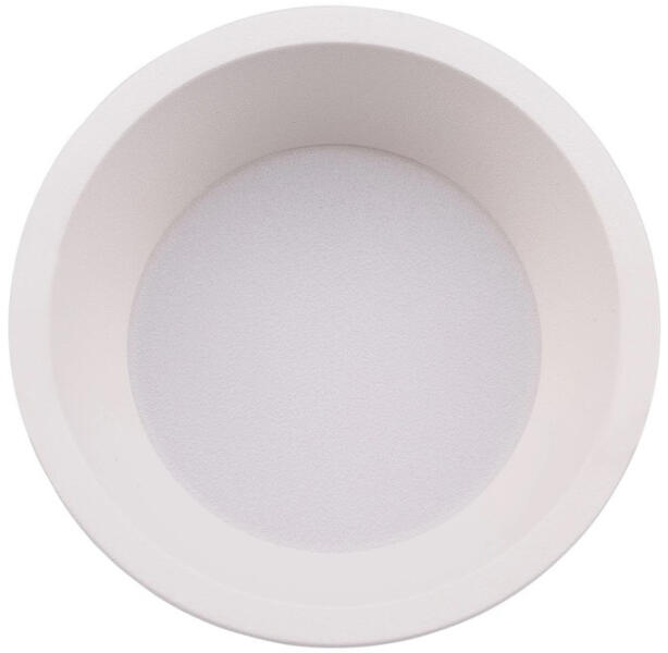 Matt fehér színű alumínium öntvény fix mennyezetbe építhető spot lámpa opálos polikarbonát búrával, természetes fehér színhőmérsékletű beépített LED fényforrással és működtetővel.