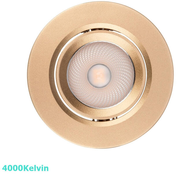 9cm átmérőjű, matt arany színű hővezető műanyagból készült billenthető mennyezetbe építhető spot lámpa polikarbonát lencsével, természetes fehér színhőmérsékletű beépített LED fényforrással és beépített működtetővel.