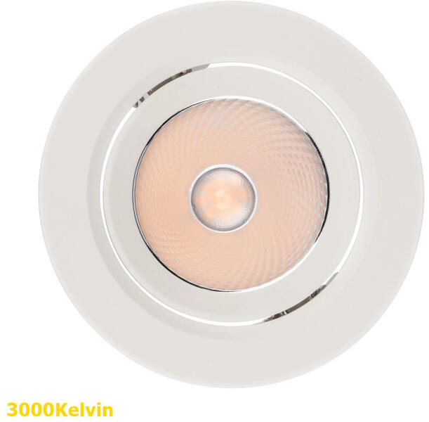 10,5cm átmérőjű, matt fehér színű hővezető műanyagból készült billenthető mennyezetbe építhető spot lámpa polikarbonát lencsével, meleg fehér színhőmérsékletű beépített LED fényforrással és beépített működtetővel.