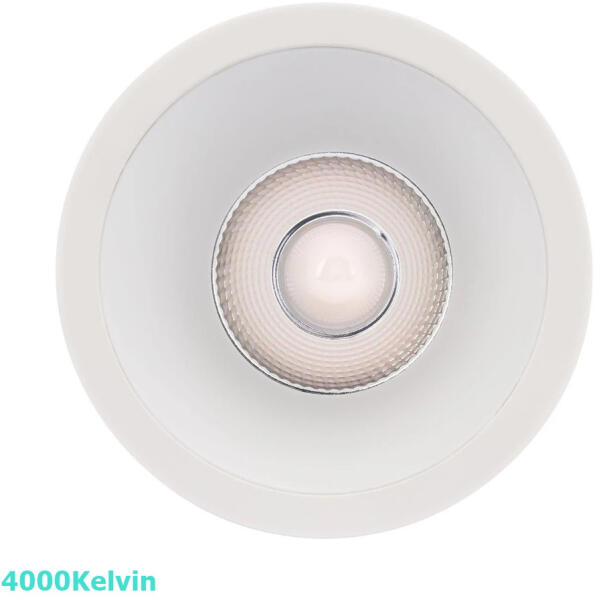 8,1cm átmérőjű, matt fehér színű hővezető műanyagból készült fix mennyezetbe építhető spot lámpa polikarbonát lencsével, természetes fehér színhőmérsékletű beépített LED fényforrással és beépített működtetővel.