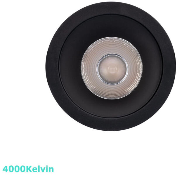 8,1cm átmérőjű, matt fekete színű hővezető műanyagból készült fix mennyezetbe építhető spot lámpa polikarbonát lencsével, természetes fehér színhőmérsékletű beépített LED fényforrással és beépített működtetővel.