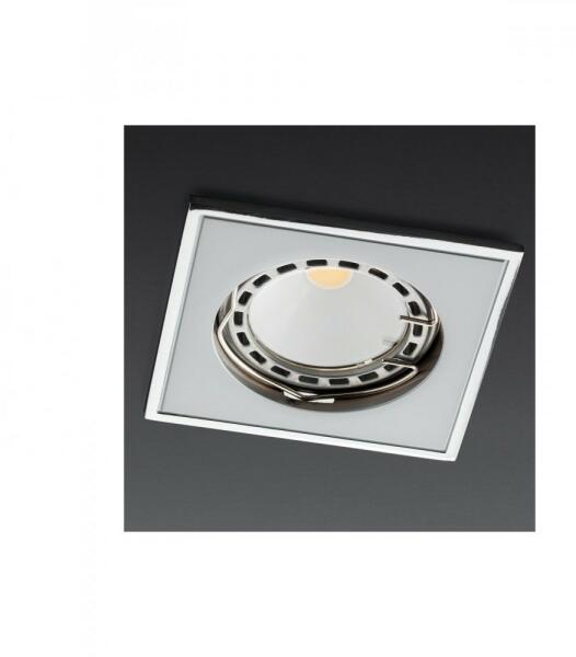 Beépíthető, szögletes mennyezeti spot lámpa, gyöngyházas és króm színű alumínium vázzal.