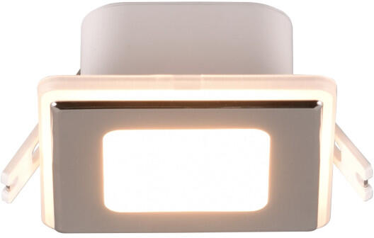 Króm színű műanyag vázas mennyezetbe építhető lámpa fehér színű műanyag búrával, meleg fehér színhőmérsékletű beépített LED fényforrással. A lámpa IP44-es védelemmel rendelkezik.